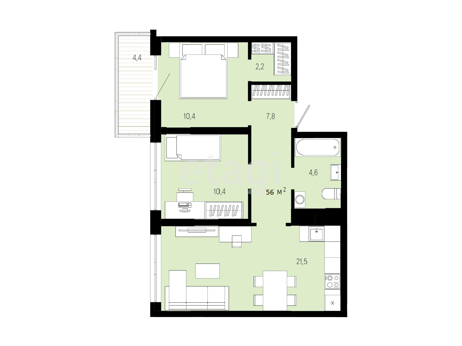 - Общая площадь: 55.8 м2