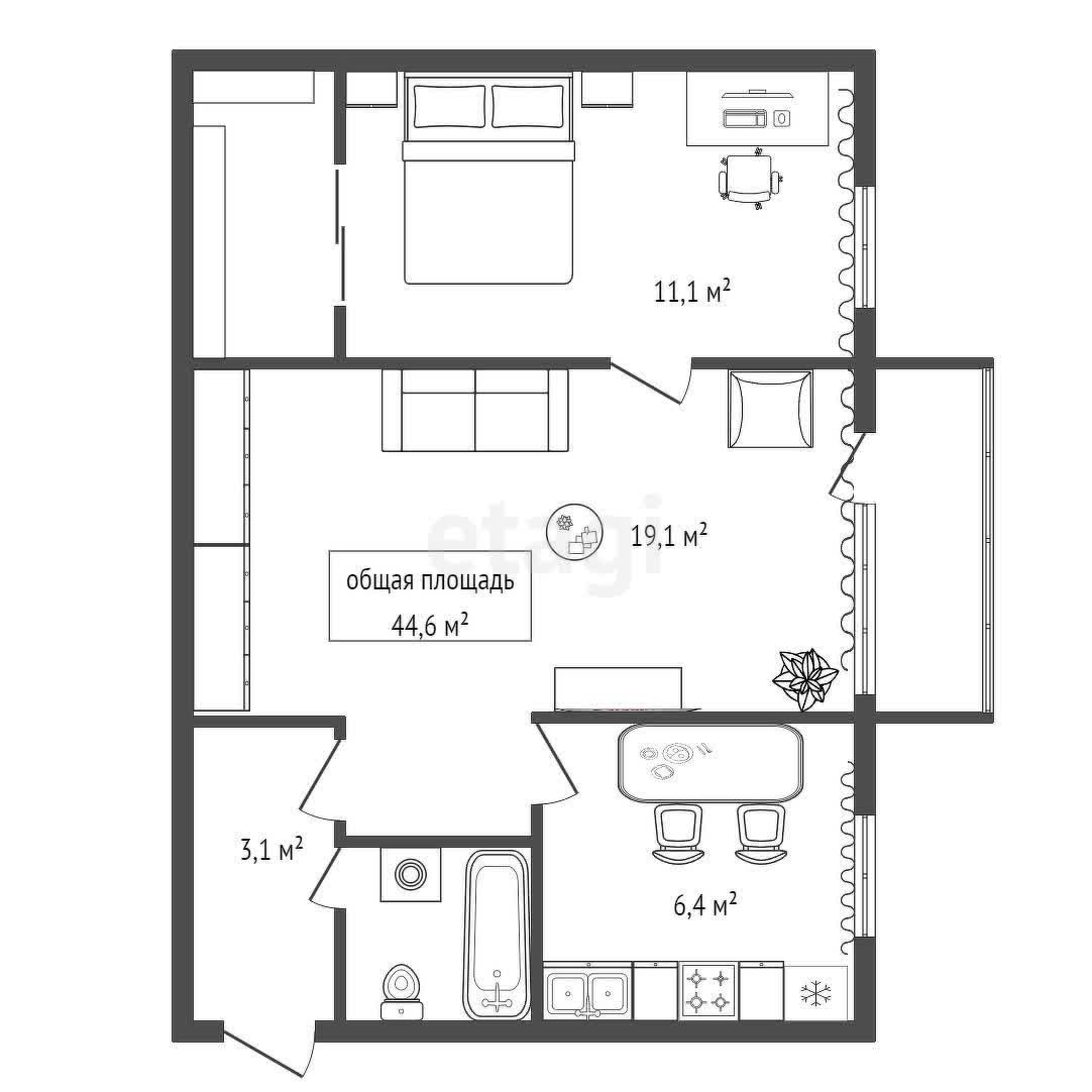 - Общая площадь 44.6 м2