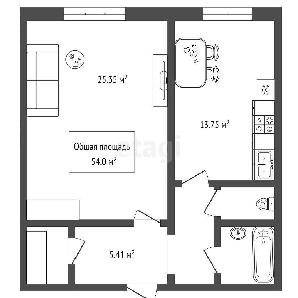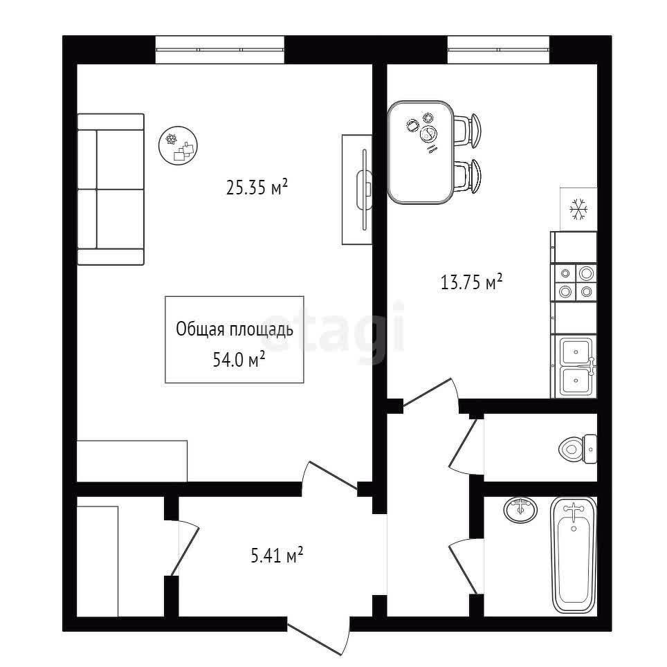 - Общая площадь: 54 м2