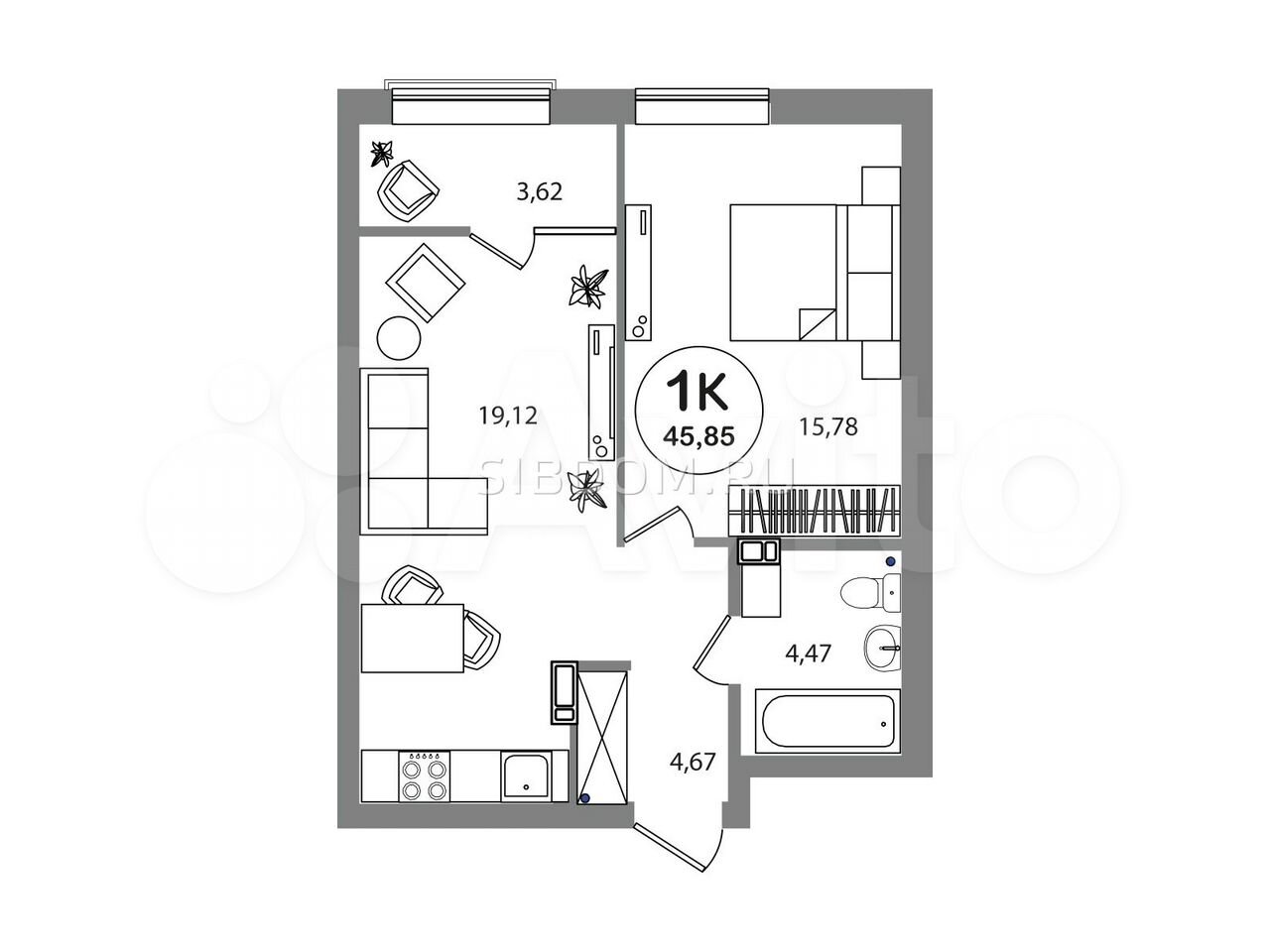 - Общая площадь: 45.9 м2