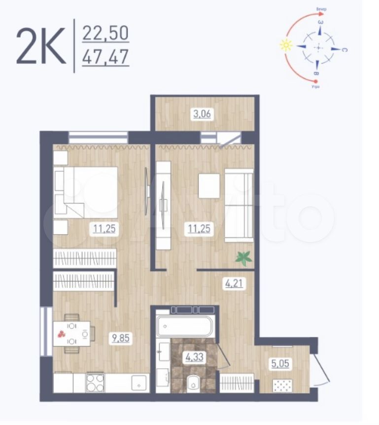 - Общая площадь 47.5 м2
