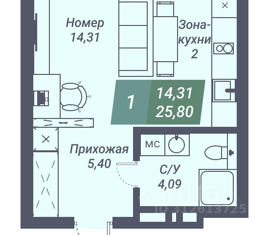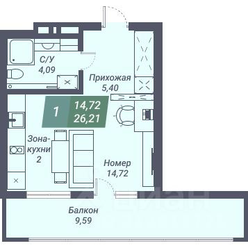 - Общая площадь: 26 м2