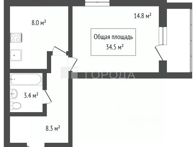 - Общая площадь 34.9 м2