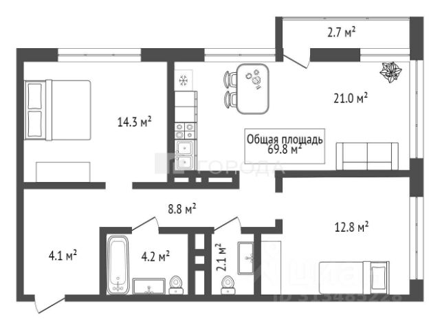 - Общая площадь: 69.8 м2