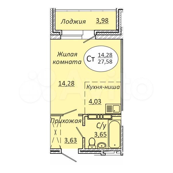 - Общая площадь 27.6 м2
