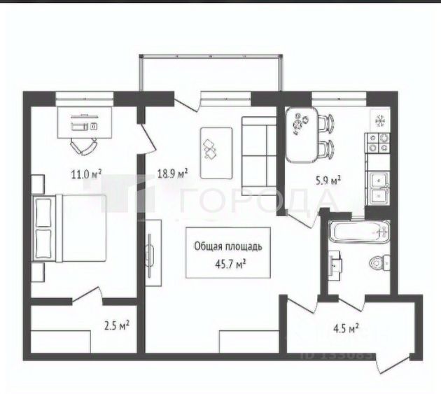 - Общая площадь 45.7 м2