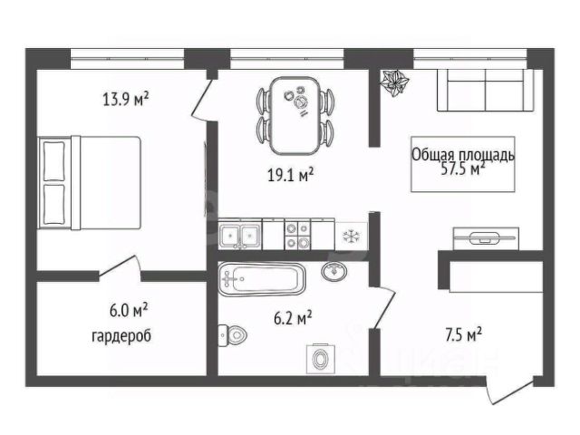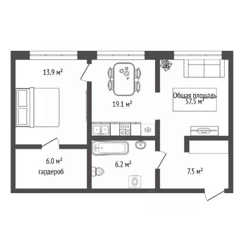 - Общая площадь: 59 м2