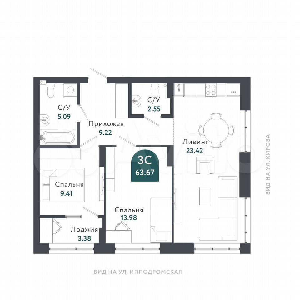 - Общая площадь: 63.7 м2