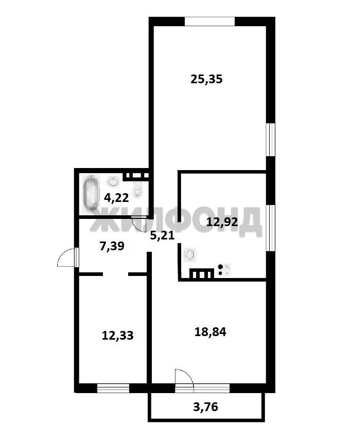 - Площадь кухни: 12.9 м2