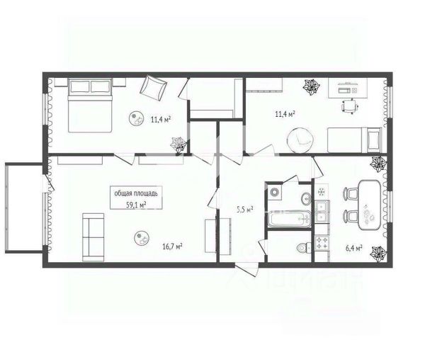 - Общая площадь 59.1 м2