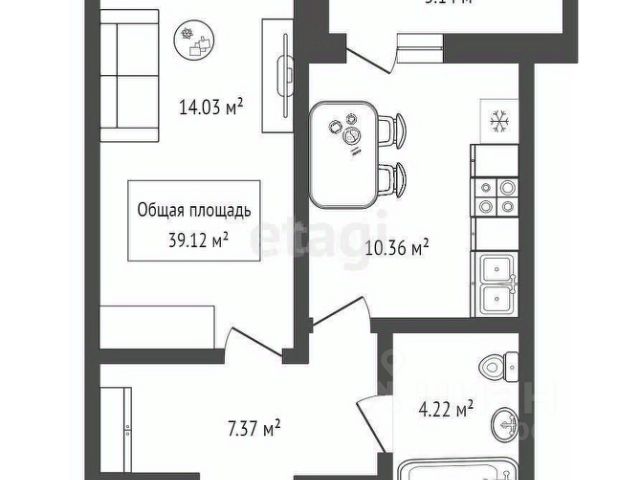 - Общая площадь 39.1 м2