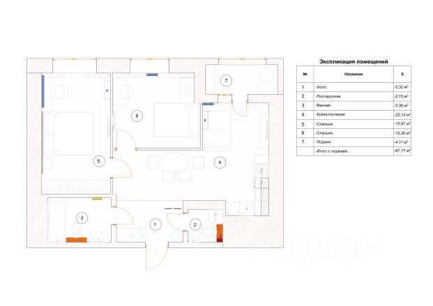 - Общая площадь: 64.5 м2