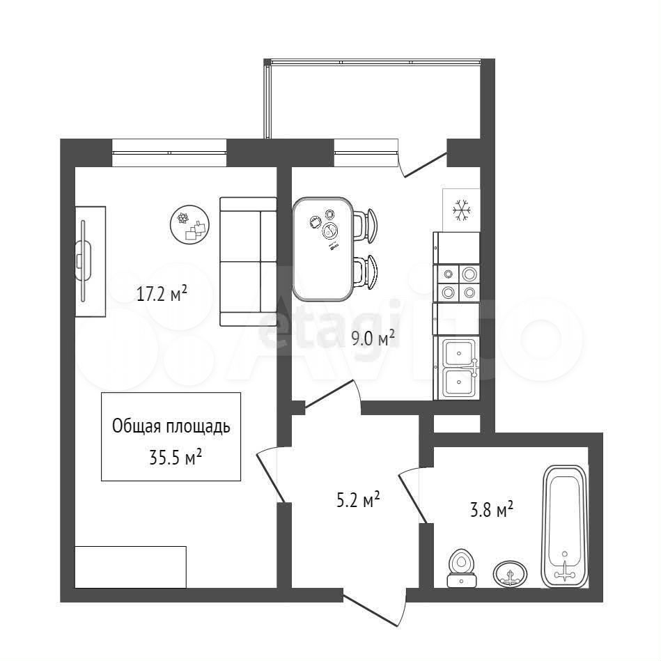 - Общая площадь: 35.5 м2