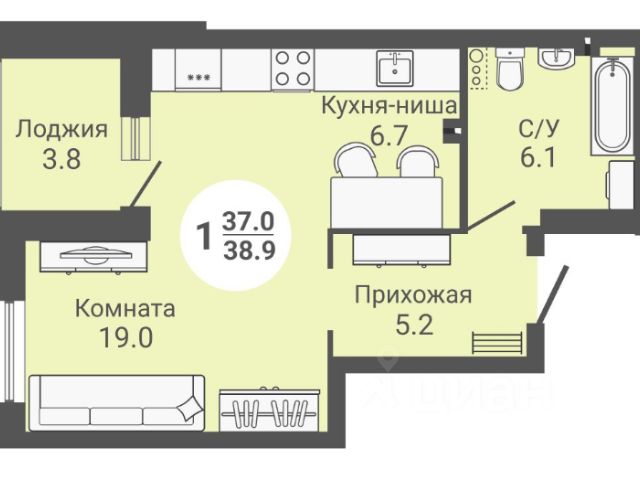 - Общая площадь 38.5 м2