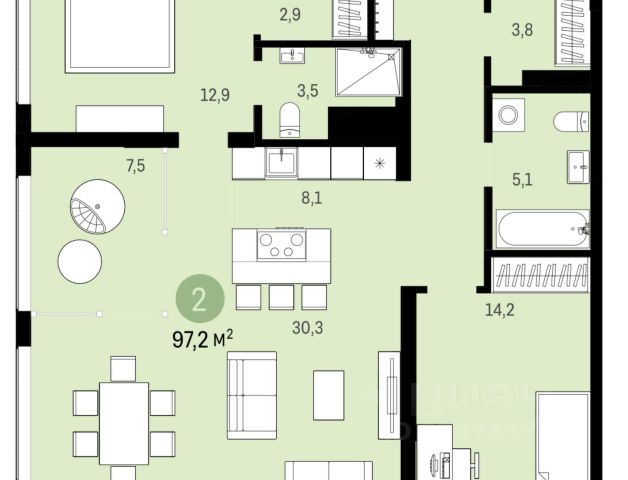 - Общая площадь 90.5 м2