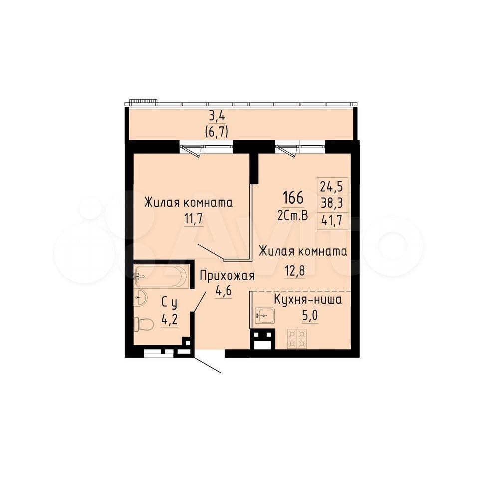 - Общая площадь 41.7 м2