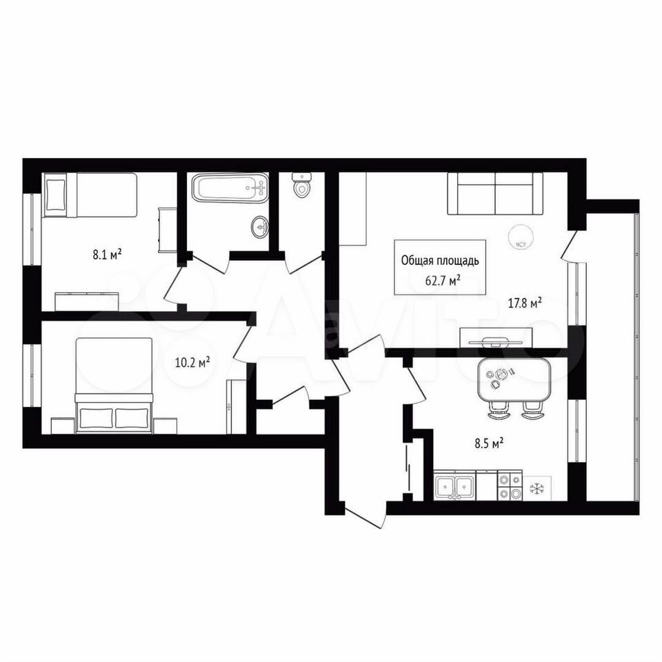 - Общая площадь: 62.7 м2