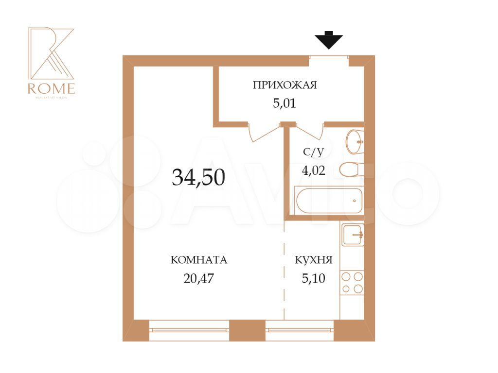 - Общая площадь 34.5 м2