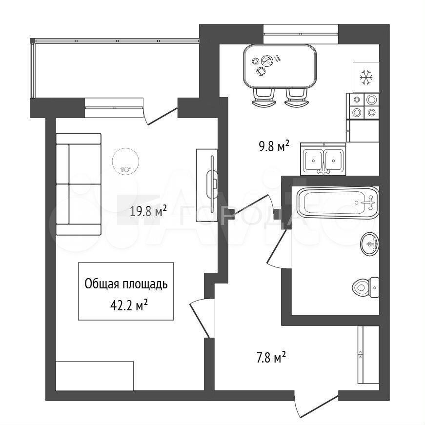 - Общая площадь 42.2 м2