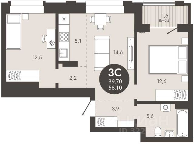 - Общая площадь 56.5 м2