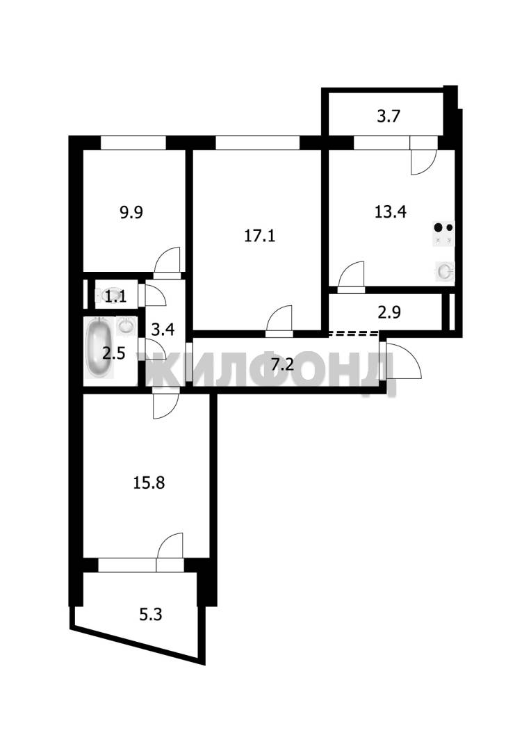 - Площадь кухни: 13.4 м2