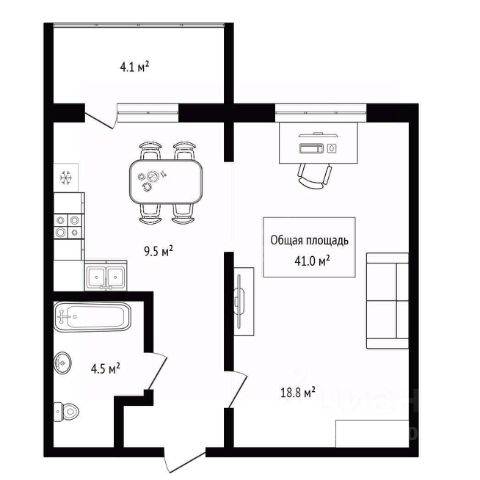 - Общая площадь: 41 м2
