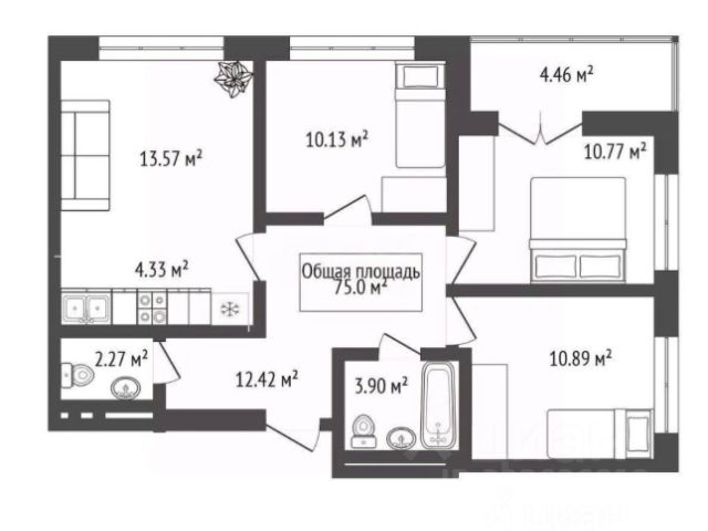 - Общая площадь: 75 м2