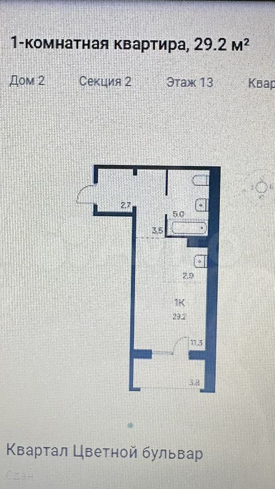 - Общая площадь 29.2 м2