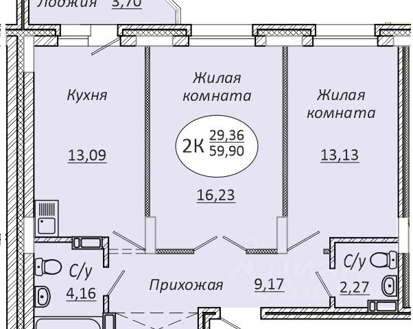 - Общая площадь 57.3 м2
