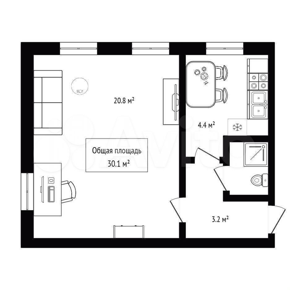 - Общая площадь: 30.1 м2
