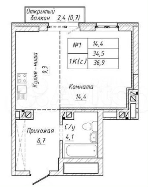 - Общая площадь 36.9 м2