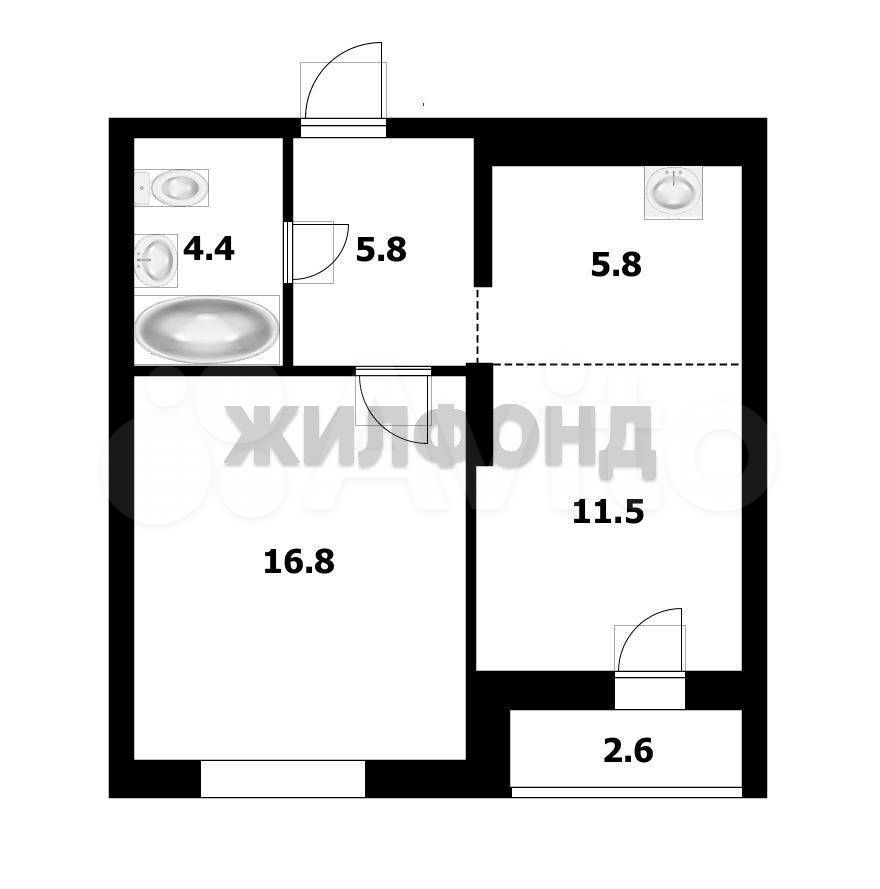 - Общая площадь 44.1 м2
