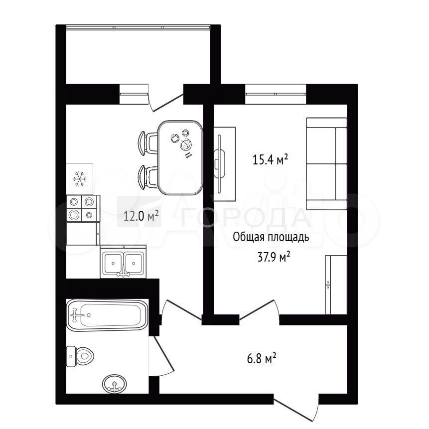 - Общая площадь 37.9 м2