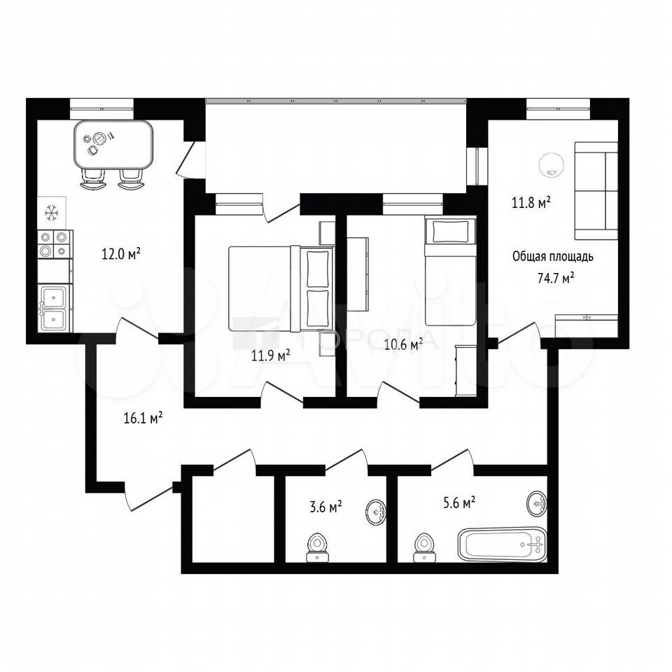 - Общая площадь 74.7 м2