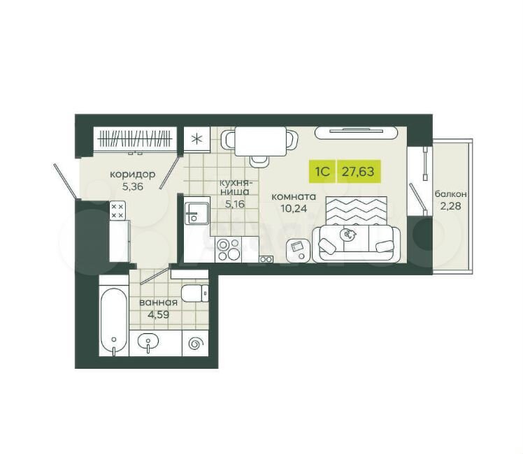 - Общая площадь 27.6 м2