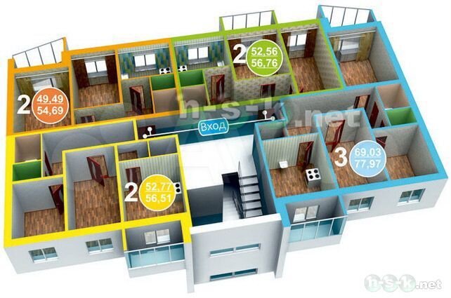 - Общая площадь: 52.4 м2
