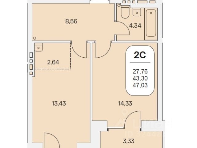- Общая площадь: 43.3 м2
