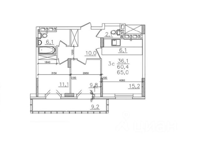 - Общая площадь: 60.9 м2
