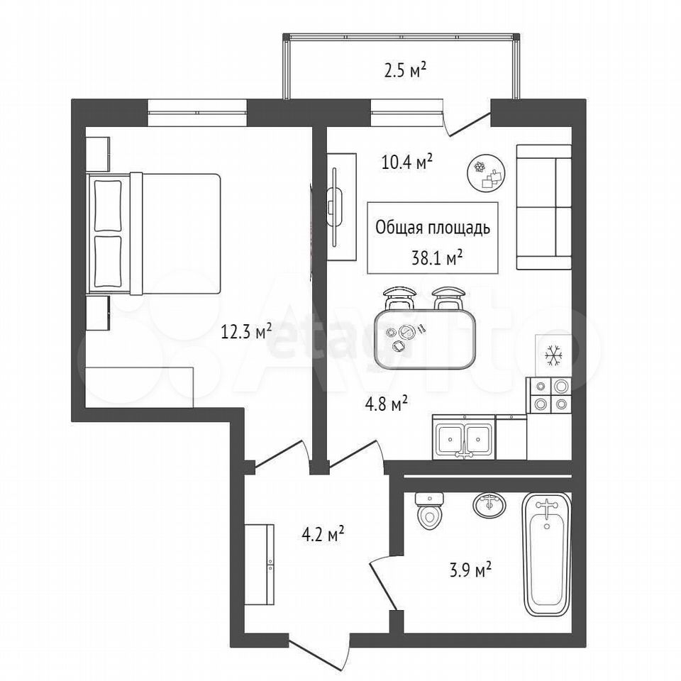 - Общая площадь 38.1 м2