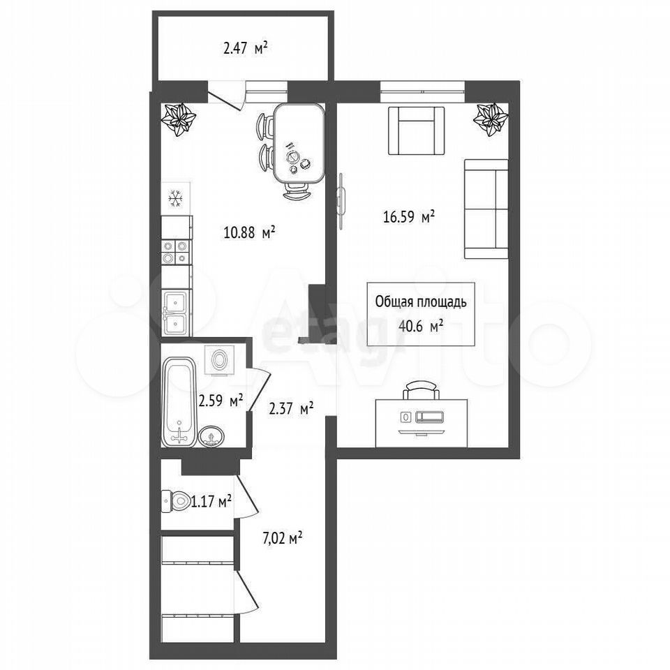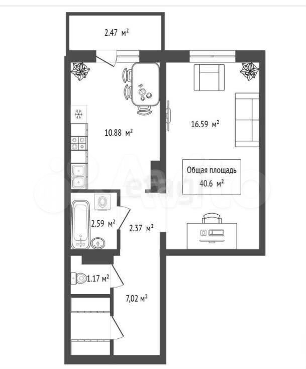 - Общая площадь 40.6 м2