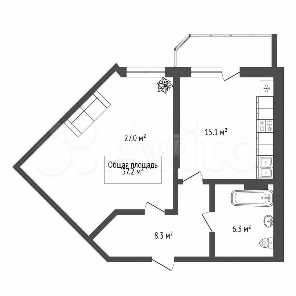- Общая площадь: 57.2 м2
