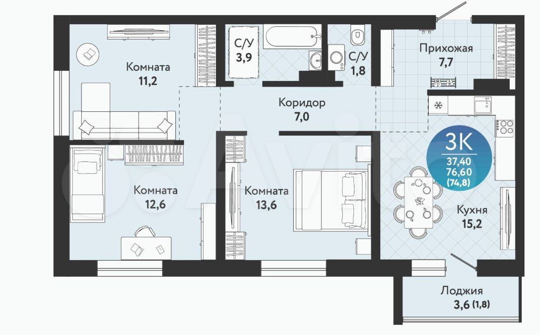 - Общая площадь 74.8 м2
