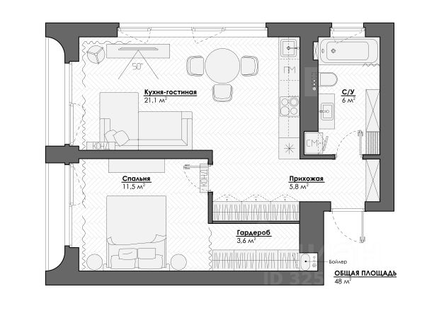 - Общая площадь: 48 м2