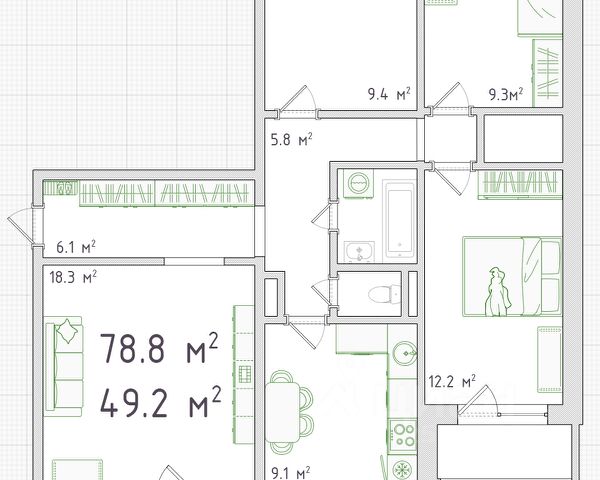 - Общая площадь 78.8 м2