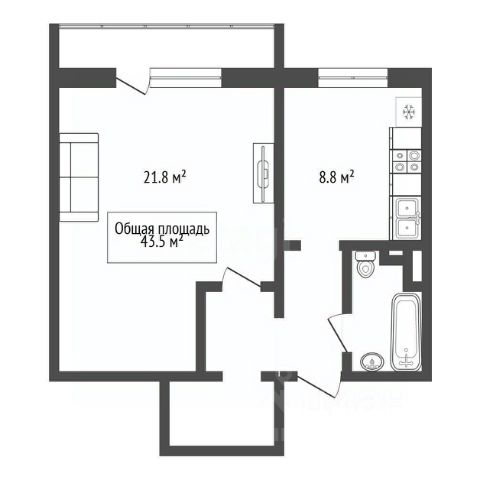- Общая площадь 43.5 м2