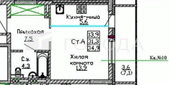 - Общая площадь 34.9 м2