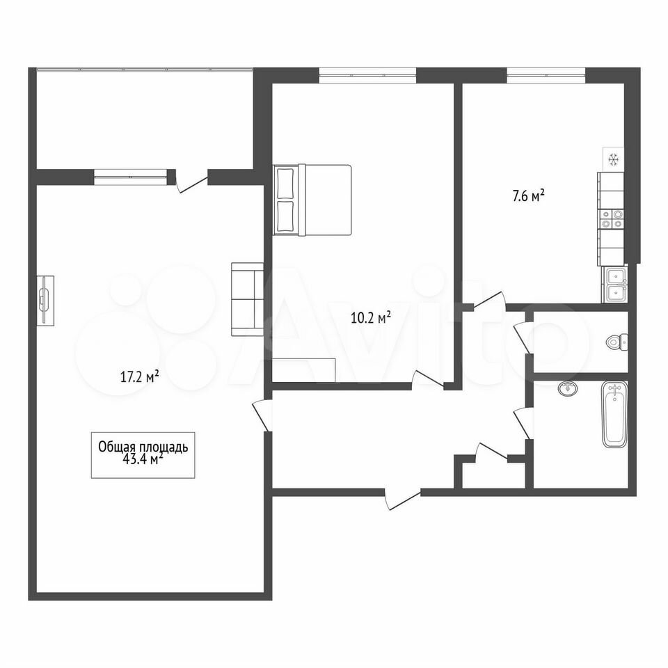 - Общая площадь: 43.4 м2