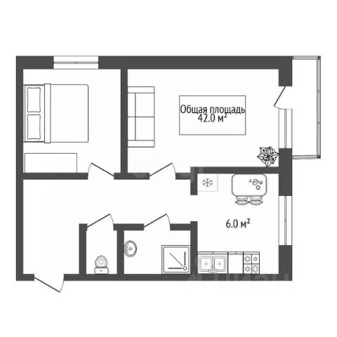 - Общая площадь: 42 м2