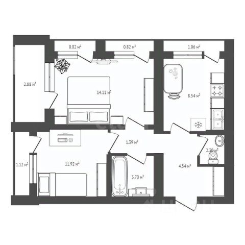 - Общая площадь 45.8 м2