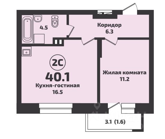 - Общая площадь: 40.1 м2